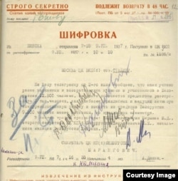 "На Вашу телеграмму от 3 июля сообщаем, что нами учтено ранее высланных и возвратившихся кулаков и уголовников в Белоруссии 12 800 человек, из этого количества предлагаем расстрелять 3 тыс. человек, как наиболее враждебных и ведущих активную контрреволюционную работу и выслать из пределов Белоруссии 9800 человек менее активных, но враждебных элементов. В состав тройки предлагаем: НКВД Белоруссии Бермана Б. Д.".