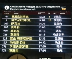 Вокзальное табло на Московском вокзале Петербурга переключается, и кириллические названия станций превращаются в иероглифы. Кроме одной строки: с 10-го пути отправится поезд в Sevastopol.