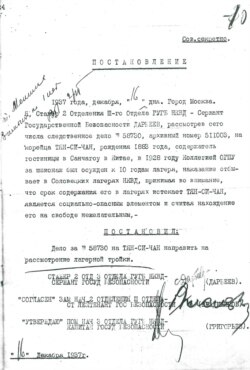 В качестве примера документации, представляемой лагерной и тюремной администрацией Тройке УНКВД, можно привести бумаги из архивно-следственного дела содержателя гостиницы Тян-Си-Чана, репрессированного в 1928 г.: