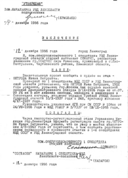 Через паспортно-регистрационный отдел Управления Милиции гор. Ленинграда оформить регистрацию смерти гр.Петрова Ивана Петровича, указав, что он умер в местах заключения 2/2 – 1943 года от перитонита, о чем сообщить родственникам осужденного и произвести отметки в 1-х спецотделах МВД СССР и УВД Ленинградской области.