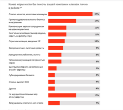 Социологи опрашивали респондентов, как они оценивают те меры поддержки, которые предлагает им государство. Большинство, 47%, считают их неправильными и несвоевременными. Другой вопрос звучал так: "Какие меры могли бы помочь вашей компании и вам лично в работе?" Как выяснилось, основные меры, которые приветствовали бы опрошенные, связаны с налоговыми каникулами, с тем, чтобы на период карантина налоги были отменены: об этом говорят 27% участников опроса, а еще 17% хотели бы прямых адресных выплат бизнесу и населению. Той поддержки, которую обещал бизнесу Владимир Путин (компенсации зарплат сотрудникам на время карантина), желали бы лишь 11% опрошенных, то есть примерно каждый десятый, да и то, очевидно, в значительно больших размерах.
