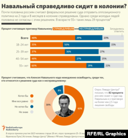 При этом скорейшего освобождения Навальному желает 61 процент от тех, кто считает решение суда несправедливым, на заключении настаивают 8 процентов, говорится в исследовании "Левада-центра".