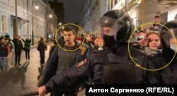 Около 9 вечера голова колонны протестующих достигла перекрестка Рождественского бульвара с Малым Кисельным переулком. Здесь и развернулись события, которые показались нам подозрительными. На видео корреспондента Радио Свобода Антона Сергиенко попали сразу несколько странных эпизодов. Его полная версия в нашем плеере – это два склеенных друг с другом куска длительностью 59 и 22 секунды, снятые практически один за другим: