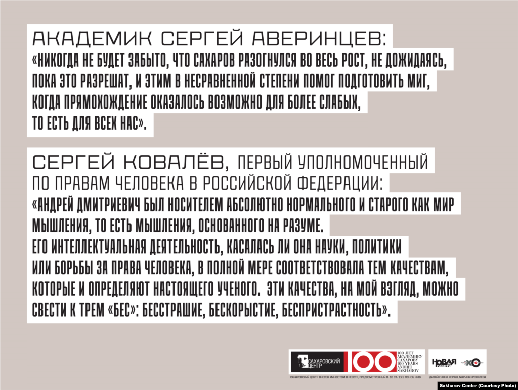 21 мая исполняется 100 лет со дня рождения советского физика-теоретика, общественного деятеля, диссидента и правозащитника Андрея Сахарова. На этой неделе в Москве на Чистопрудном бульваре должна была открыться фотовыставка к юбилею, подготовленная Сахаровским центром. Однако правительство Москвы отказало в ее проведении, устно сообщив организаторам, что "контент не согласован". Радио Свобода публикует все материалы выставки, переданные редакции Сахаровским центром.