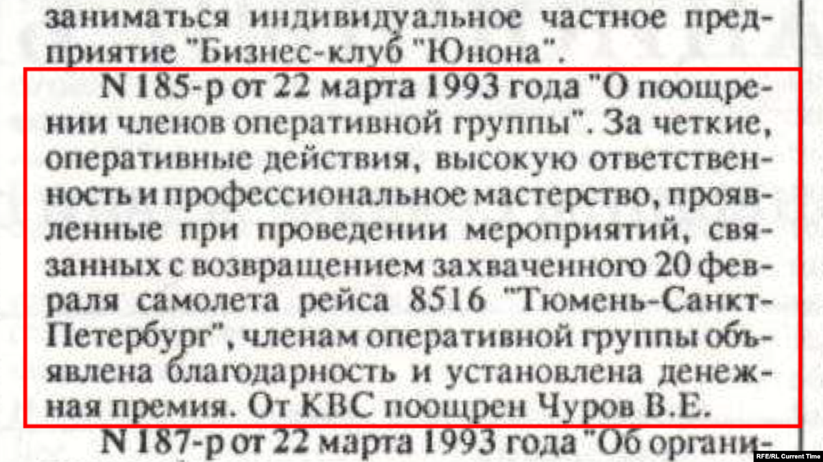 В бюллетене комитета внешних связей петербургской мэрии за 1993 год можно обнаружить краткую справку c упоминанием фамилии Владимира Чурова, будущего главы ЦИК России, а в те времена работавшего главным специалистом путинского комитета. Чурову объявляется благодарность (и выписывается премия) за профессионализм при возвращении в Россию угнанного в Швецию самолета рейса Тюмень – Санкт-Петербург. Какой была роль Чурова в этом деле, нам выяснить не удалось. Скорее всего, путинский комитет, воспользовавшись связями в Швеции, помог российской авиакомпании вернуть на родину угнанный самолет. За этой историей скрывается удивительная судьба угонщика-мстителя и любителя кошек Тамерлана Мусаева.
