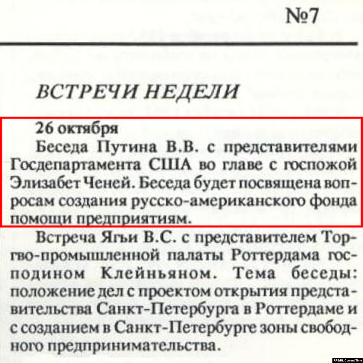 Осенью 1992 года, как следует еще из одной крохотной заметки в Бюллетене комитета по внешним связям, Владимир Путин встретился с делегацией Госдепартамента США. На повестке дня было создание фонда для поддержки российского бизнеса. В мероприятиях участвовало американское правительственное агентство по международному развитию USAID, работу которого российские власти запретили 20 лет спустя, в 2012 году.