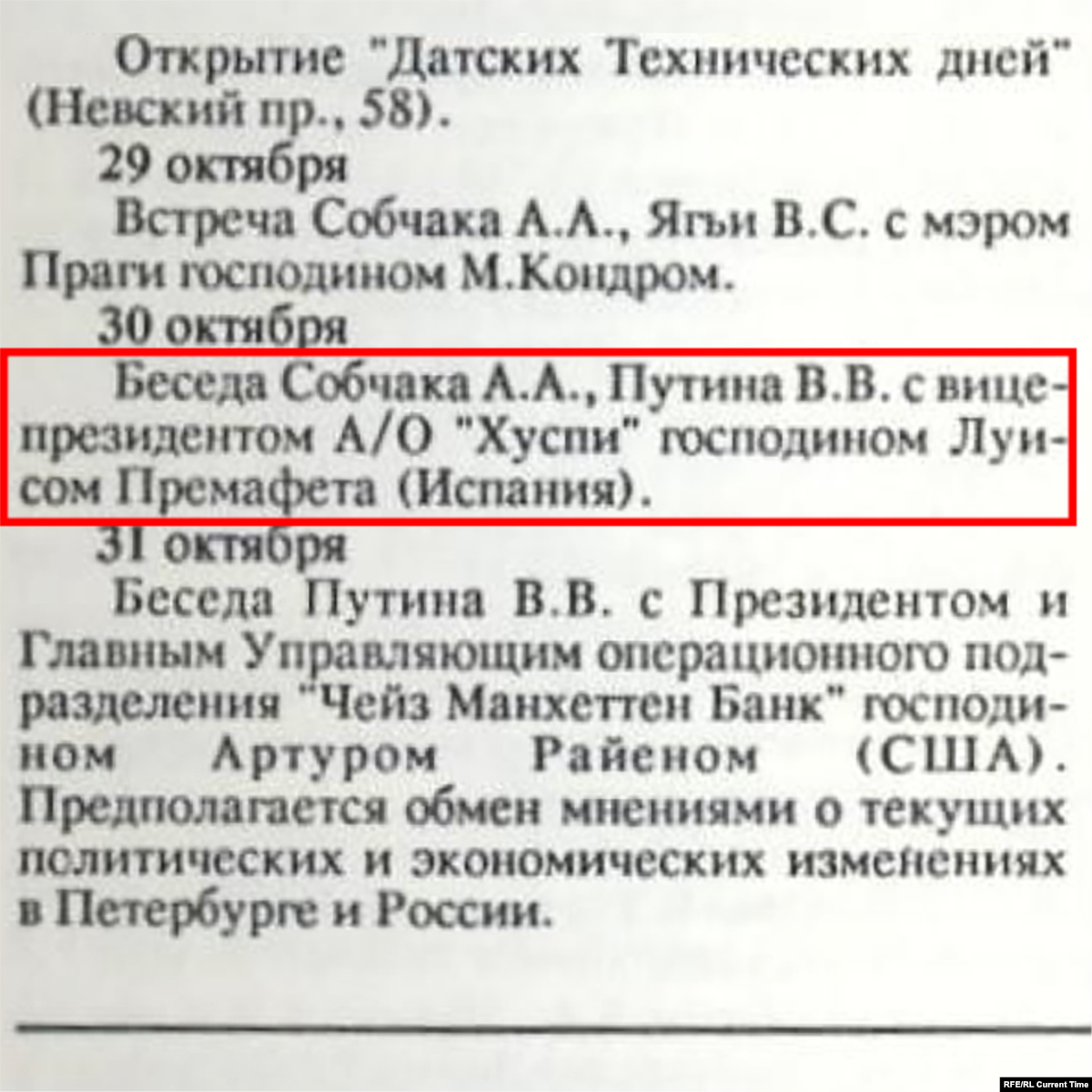 30 октября 1992 года Анатолий Собчак и Владимир Путин, как следует из пары скупых строк в бюллетене, встретились с "господином Луисом Премафета, вице-президентом А/О Хуспи". "Хуспи" – компания, созданная специально для инвестиций в Россию, равные доли в нее вложили упомянутый выше глава "Чупа-Чупс" Бернат и Луис Пренафета (именно так, через "н", а не через "м", как в бюллетене, правильно пишется по-русски его имя).