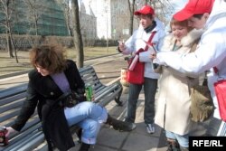 Начало работы: отдыхающей на Чистопрудном бульваре молодежи предлагают заполнить опросник и выразить свое отношение к политике и политикам.