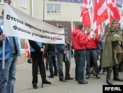Под государственным гербом на фасаде эстонского посольства в Москве явственно просматривается коричневое пятно, оставшееся от вчерашнего «обстрела», хотя кое-где следы отчищали вместе со штукатуркой. Несколько десятков представителей «Молодой гвардии» и «Наших», сменяя друг друга, дежурят в пикете у нарисованного на бумаге таллинского памятника Воину-освободителю. В руках у них плакаты «Вторая мировая война продолжается! Фашизм угнездился в Эssтонии», «Прихвостни НАТО, руки прочь от русского солдата!». Пикетчики скандируют «Эстонские дебилы, прочь от нашей могилы!» и «Фашизм не пройдет!». К середине дня у посольства появился «козлик» с эмблемой ЛДПР и несколько человек с бело-голубыми флагами присоединились к митингующим. Пока разрешенный до 17 часов пикет проходит без эксцессов, но к посольству стягивается ОМОН, видимо, в ожидании обещанной вечером акции ДПНИ.