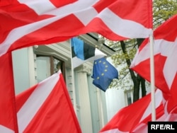 Флаги Эстонии и ЕЭС на посольстве с трудом просматриваются сквозь полотнища "Наших"