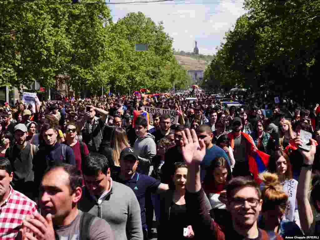 После ареста оппозиционного лидера Никола Пашиняна демонстрации не прекратились, несмотря на предупреждение полиции. Протесты начались после того, как бывший президент страны Серж Саргсян решил стать премьер-министром, изменив конституцию и передав основные полномочия исполнительной власти в стране от президента премьеру. (Фотографии Амоса Чаппла, РСЕ/РС )