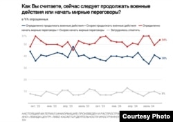 На первый взгляд, сохраняется и баланс мнений о том, надо ли продолжать военные действия или начинать мирные переговоры с Украиной. По последним данным, 54% опрошенных считают, что необходимо начать переговоры, и 38% выступают за продолжение войны. Получается, что за переговоры большинство, которое от месяца к месяцу колеблется в диапазоне примерно от 50 до 58% в зависимости от хода военных действий.
