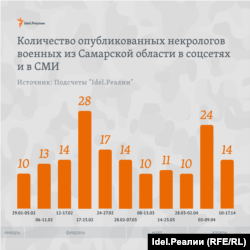 Idel.Реалии заметил, что в январе-марте количество сообщений о смерти военных из Самарской области значительно увеличилось, что косвенно подтверждает эти слова. Так, до января 2023 года за неделю можно было обнаружить три-четыре некролога о смерти военнослужащих из этого региона. Всего погибших из Самарской области за весь 2023 год (исключая Макеевку) было 133 человека (то есть примерно по три некролога в неделю с 24 февраля 2022 года). Это, безусловно, не точная цифра, а лишь минимальная – по опубликованным некрологам в соцсетях и в СМИ.
