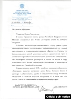После публикации этой статьи в редакцию Радио Свобода обратилась российская ассоциация "Фалунь Дафа". "В российском информационном пространстве достаточно много клеветнических статей о "Фалуньгун", в которых нас выставляют организацией, якобы направляемой и финансируемой из-за рубежа, что абсолютно не так", – говорится в письме. Для подтверждения этих слов редакции направлен документ из министерства иностранных дел России, в котором говорится: "В России с неизменным уважением относятся к праву граждан страны на исповедание близких им религиозных и идейных ценностей, что в полной мере относится и к последователям движения "Фалуньгун"... Взаимоотношения властей КНР и китайских последователей движения "Фалуньгун" являются внутренним делом Китая… Россия и Китай не вмешиваются во внутренние дела друг друга". Мы публикуем копию этого письма.