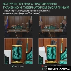 Установить подмену удалось благодаря раскладке книг в шкафу рабочего кабинета в Кремле: ее изменили в феврале 2025-го, на "консервах" она старая, а на кадрах с по-настоящему свежих событий расстановка и набор книг существенно изменились.