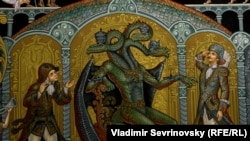 Потом я обратился к творчеству Евгения Шварца, пьеса "Дракон". У дракона на одной голове тиара первосвященника – это власть, которая пытается доминировать и в религиозном смысле, корона – это светская власть и шлем – военная сила. То есть дракон – олицетворение некоей власти, которая сидит в золотом убранстве, везде портреты дракона. Люди хлопают, пионеры в барабаны бьют – воспоминание из советского детства, где все всё одобряли. Заключенных в темницу сажают. Воины идут в одну сторону браво, с другой стороны уже возвращаются израненные. И двое влюбленных, которые тянутся друг к другу. Любовь на фоне тоталитарного мироустройства. Надежда всегда должна быть, иначе будет какой-то мрак, безнадега. Хочется видеть луч света.