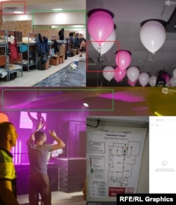 Кроме того, он выложил фотографии помещения с двухъярусными кроватями, в котором жил с другими рабочими. Мы геолоцировали это место как бывшее помещение клуба "Сакура" в Валуйках на улице Белинского. Геолокацию подтверждает и еще один выложенный рабочим снимок – на нем изображена схема эвакуации из здания клуба. Как и на опубликованном Анатолием Шарием видео, на этих фотографиях нет никаких признаков того, что в помещении живут военные, а на кроватях развешены такие же синие рабочие спецовки со светоотражающими полосами.
