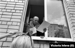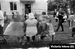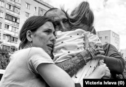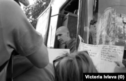 Другая стоит прямо возле автобуса с вернувшимися из плена, держит фотографии мужа, на них только лицо крупным планом.