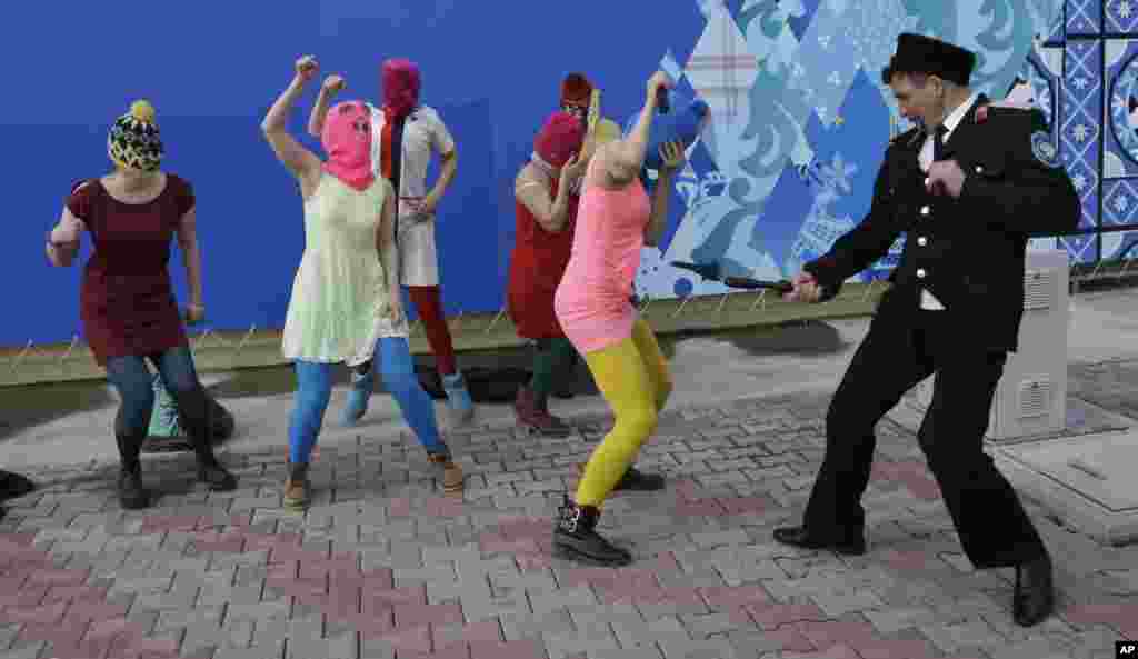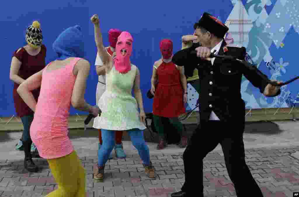 Несколько казаков подошли к группе людей, гулявших в районе Морского вокзала Сочи, среди которых находились участницы Pussy Riot Надежда Толоконникова и Мария Алехина. Один из казаков распылил над их головами слезоточивый газ, после чего начал хлестать девушек нагайкой. Другие "казаки" также стали бить гулявших. При этом, по свидетельству очевидцев, они выкрикивали угрозы в адрес Толоконниковой и Алехиной, требуя, чтобы девушки покинули город.