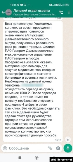 "Уважаемые коллеги, за время проведения спецоперации появилось очень много в/служащих Дальневосточного военного округа, получивших различного рода ранения и травмы. Филиал ПАО Газпром, Дальневосточное межрегиональное управление ПАО Газпром в городе Хабаровске, вызвался оказать материальную помощь для закупки медикаментов, которых катастрофически не хватает в больницах и военных госпиталях. Необходимо на данный номер телефона осуществить перевод на сумму не менее 1000 рублей. После перевода средств на тот же номер по вотсапу необходимо отправить последние 4 цифры и свою фамилию. Это необходимо сделать, так как в дальнейшем будет сделан отчет для руководства отряда о том, сколько человек приняли активное участие по оказанию материальной помощи и количество тех, кто проигнорировал данную просьбу", – написано в сообщении (орфография и пунктуация сохранены).