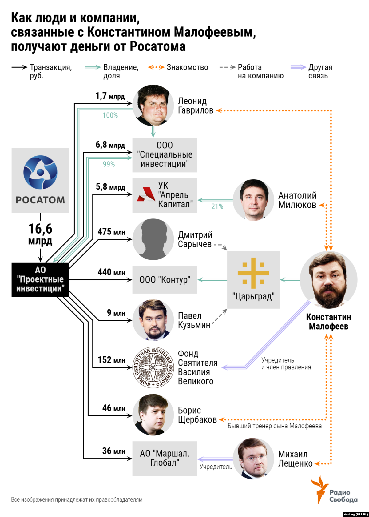"Апрель капитал" тоже был совладельцем AT Consulting – приобрел 14,5% акций у "Проектных инвестиций" Гаврилова перед сделкой с "Росатомом". Примечательно, что за полгода до нее "Апрель капитал" раскрыл рыночную стоимость своего пакета – 688 млн рублей ($9 млн). Получается, на тот момент вся компания могла стоить менее 5 млрд рублей ($64 млн) – в четыре раза меньше суммы, за которую ее в итоге купил "Росатом". Вероятно, "Апрель капитал" тоже участвовал в сделке. По крайней мере, с 2022 года УК не публикует информацию о своих акциях AT Consulting. Таким образом, структуры, у которых прослеживаются связи с Малофеевым, могли выручить за свои акции до 19,8 млрд рублей ($260 млн).