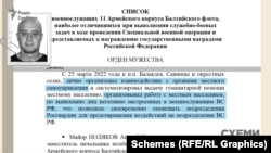 Как выяснили "Схемы", одним из представленных к награде был 30-летний прапорщик Сергей Пашкеев из Сочи, начальник секретной части 9-го мотострелкового полка 18-й мотострелковой дивизии 11-го армейского корпуса армии РФ. "Лично обеспечил ведение секретного делопроизводства управления 11-го армейского корпуса и группировки войск "Балаклея". Во время артиллерийского обстрела командного пункта лично участвовал в эвакуации секретных документов, в результате чего не допустил потери носителей сведений, составляющих государственную тайну", – говорится о Пашкееве в справке, обнаруженной на потерянной российскими военными флешке.