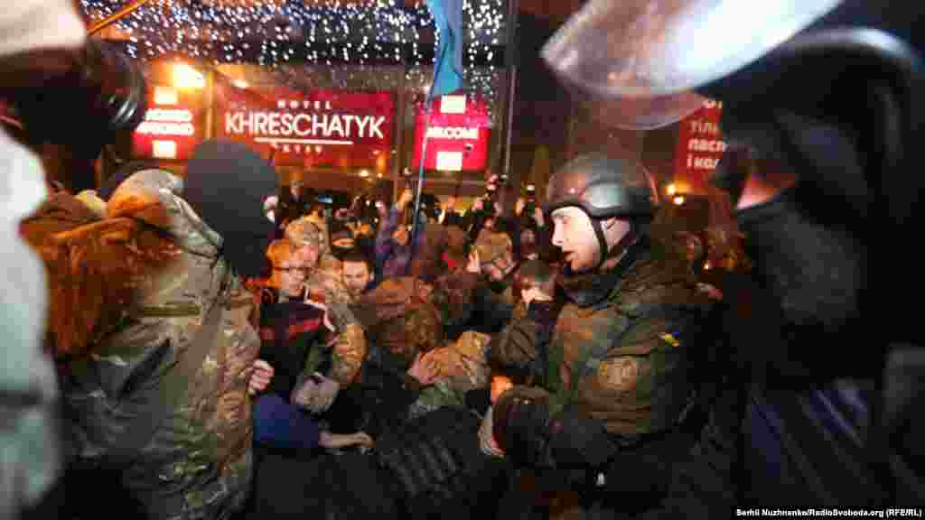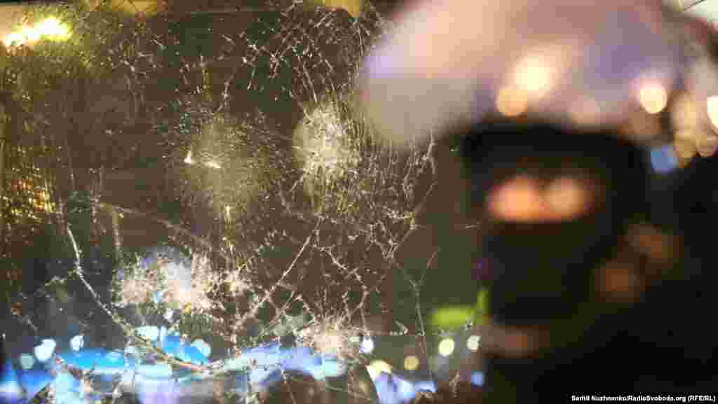 Протестующие бросают камни и пиротехнические средства через головы милиции