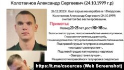 Последний пропавший человек с "Новочеркасска", о котором сообщалось публично, 24-летний Александр Колотвинов. В объявлении о поиске его жена Надежда пишет, что "26 декабря на корабле был взрыв", но не упоминает, на каком именно.