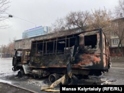 Корреспонденты Радио Свобода передают новые фотографии из центра Алматы, сделанные утром 10 января. На этих снимках видно, что в городе осталось еще довольно много следов мародерства и столкновений протестующих с полицией.