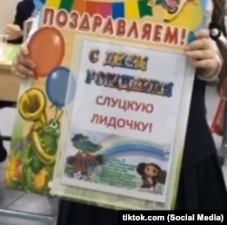 Лидия Слуцкая также публиковала в тиктоке свои детские фото, на одном из них – школьное поздравление с именем и фамилией.