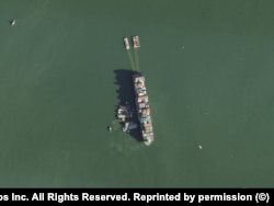В марте 2022 года контейнеровоз Ever Forward ("судно-брат" контейнеровоза Ever Given, заблокировавшего Суэцкий канал в 2021 году) сел на мель в Чесапикском заливе в США и застрял там на целый месяц. На этом снимке SkySat, сделанном 14 апреля 2022 года, видно, как баржи выгружают контейнеры с корабля, чтобы его можно было снять с мели.