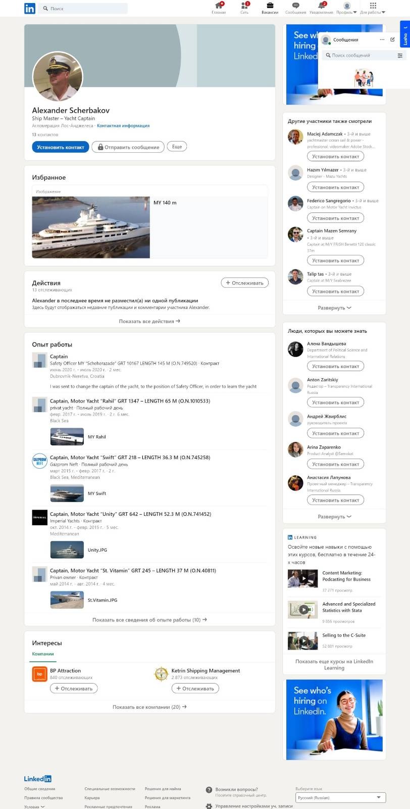 Радио Свобода также нашло в интернете одного из предыдущих капитанов "Шехерезады", Александра Щербакова. Судя по данным об опыте работы в его профиле в LinkedIn, Щербаков работал на "Шехерезаде" всего 2 месяца, в июне и в июле 2020 года, то есть был первым капитаном после ее постройки.