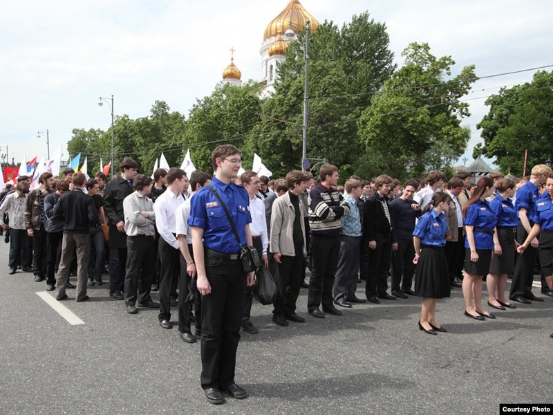 Приезжаю к Храму Христа Спасителя, от которого и должен начаться крестный ход. Гаишник говорит - иди на набережную, строятся все там, только там уже все перекрыто. Действительно, перекрыто, но еще пускают. Действительно, строятся. Представители трудовых коллективов, студенты институтов, представители молодежных организаций, ветераны войны и труда, физкультурники и спортсмены. В конце колонны - представители столичных округов, строго в алфавитном порядке. Возглавляет шествие градоначальник, замыкает большая колонна "России молодой". Звона колоколов не слышно из-за громкой песни "Дорогая моя столица..."